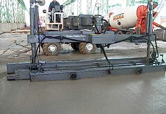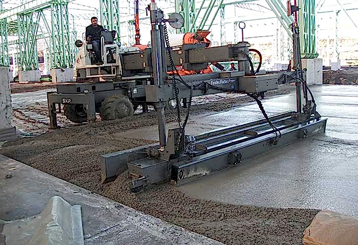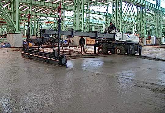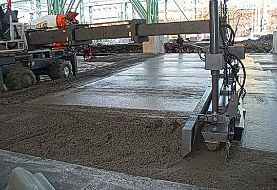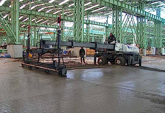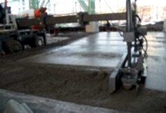 Beton yerden verilen yerleşim alanına 5 m genişlikli şeritli beton dökülerek laser screed aracı, teleskopik bum beton altında ileri sürülecek şekilde hareket etmektedir.Çalışma bloğu lazer verici tarafından tayin edilen yerleşim alanına uygulandığı zaman, teleskopik bum yer değiştirerek çalışma bloğu yeni konulmuş betonun üzerinden sadece bir defa geçerek onun ayarlanmasını ve sıkılaştırılmasını sağlamaktadır.